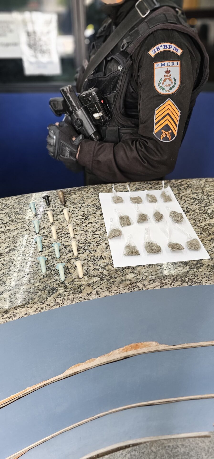 Na abordagem, foram encontrado 14 trouxinhas de maconha, 13 de pinos de cocaína e R$ 20. Participaram os seguintes policiais: 1º sargento Pablo, 3º sargento Flávio, 3º sargento Werneck, além dos cabos Machado e Túlio