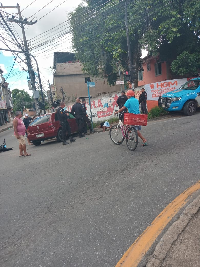 Segundo informações de testemunhas, um homem numa moto tentou fugir do cerco policial quando atingiu um carro (Gol vinho). O suspeito foi arremessado com o impacto. O veículo subiu na calçada e quase atingiu um muro.