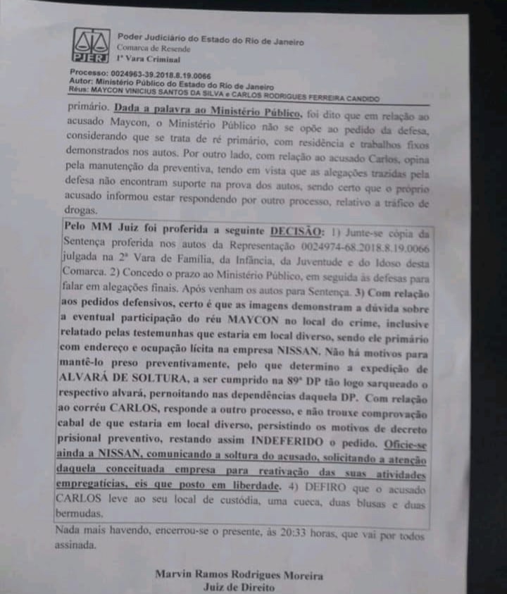 Diante das provas, o juiz Marvin Rodrigues Moreira determinou nesta quinta-feira (6) a soltura imediata de Maycon.
