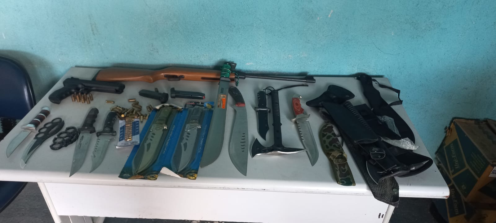 Chegando, os agentes encontraram a vítima que confirmou o teor da denúncia. Na revista ao suspeito, os policiais encontraram diversas armas como, por exemplo, espingarda de chumbinho, uma pistola de airsoft, duas machadinhas, oito facas e dois facões. E ainda: 48 munições de arma de fogo, um ca1rregador de pistola 380, um soco inglês e porta carregadores.