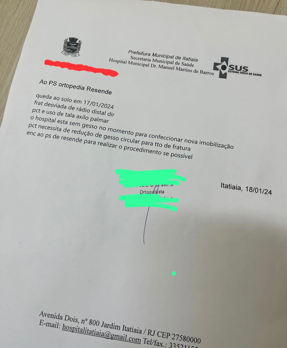 A Prefeitura de Itatiaia, por meio da Secretaria de Saúde e da Superintendência do Hospital Municipal Dr. Manoel Martins de Barros, informa que nesta quinta-feira, dia 18 de janeiro, houve, por parte de um fornecedor, atraso na entrega de alguns materiais, dentre eles gesso ortopédico. Assim, foi necessário direcionar, para Resende, um paciente, que deu entrada com uma fratura no pé.