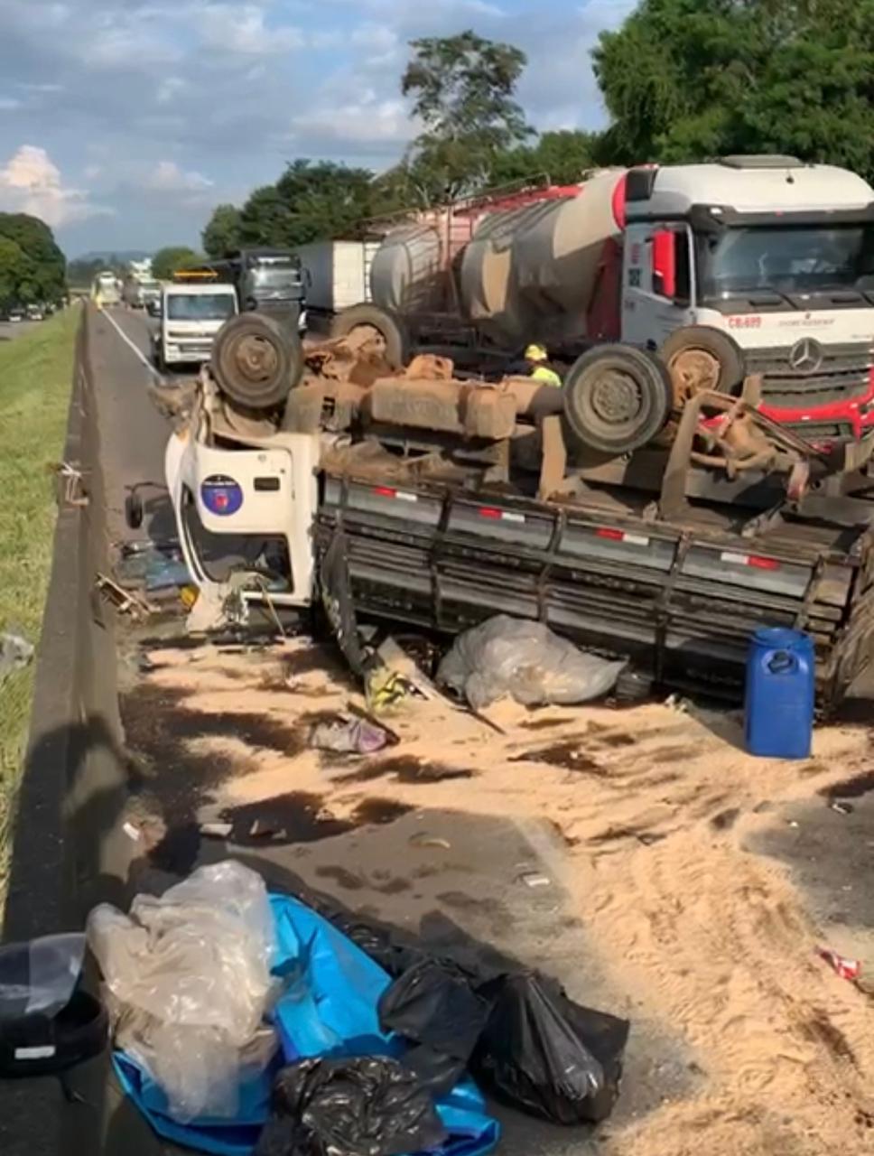 Segundo informações de testemunha, ele teria batido numa carreta que não parou. As quatro rodas do caminhão ficaram viraram para cima e o carga de areia derramou na pista. O acidente causou um enfartamento de seis quilômetros. (Imagem: Milton Teixeira).