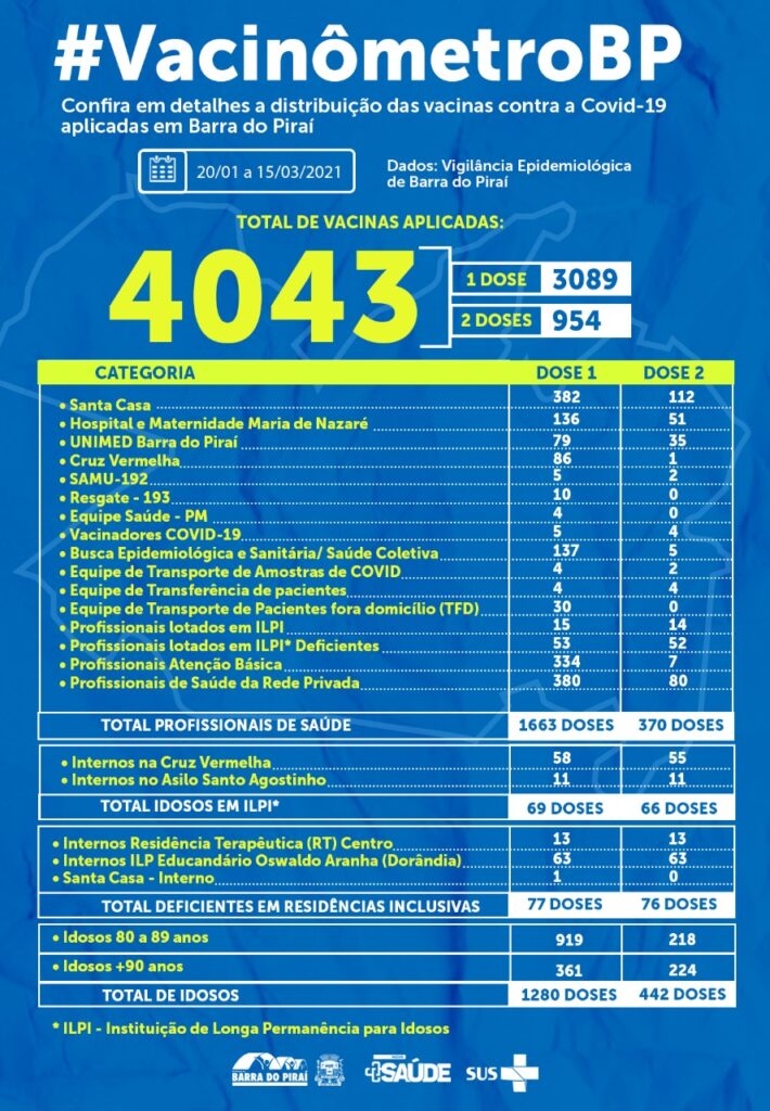 O governo municipal alertou ainda que há pessoas que estão vendendo vagas na fila aos idosos, o que é considerado crime. Ainda segundo a prefeitura, 4.043 pessoas já receberam a vacina na cidade (veja o quadro abaixo).