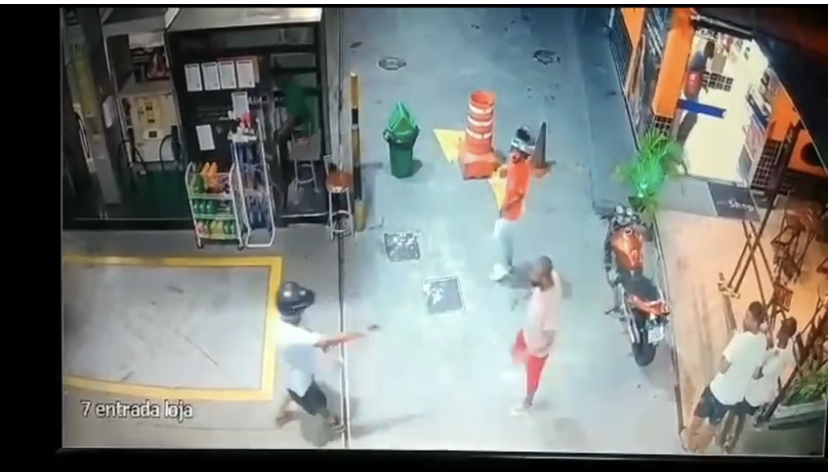 A confusão começou quando dois homens (um negro com camisa clara e outro de camisa branca e capacete) começaram a discutir. Durante o bate boca, o de capacete saca uma arma e começa a atirar contra o homem negro.