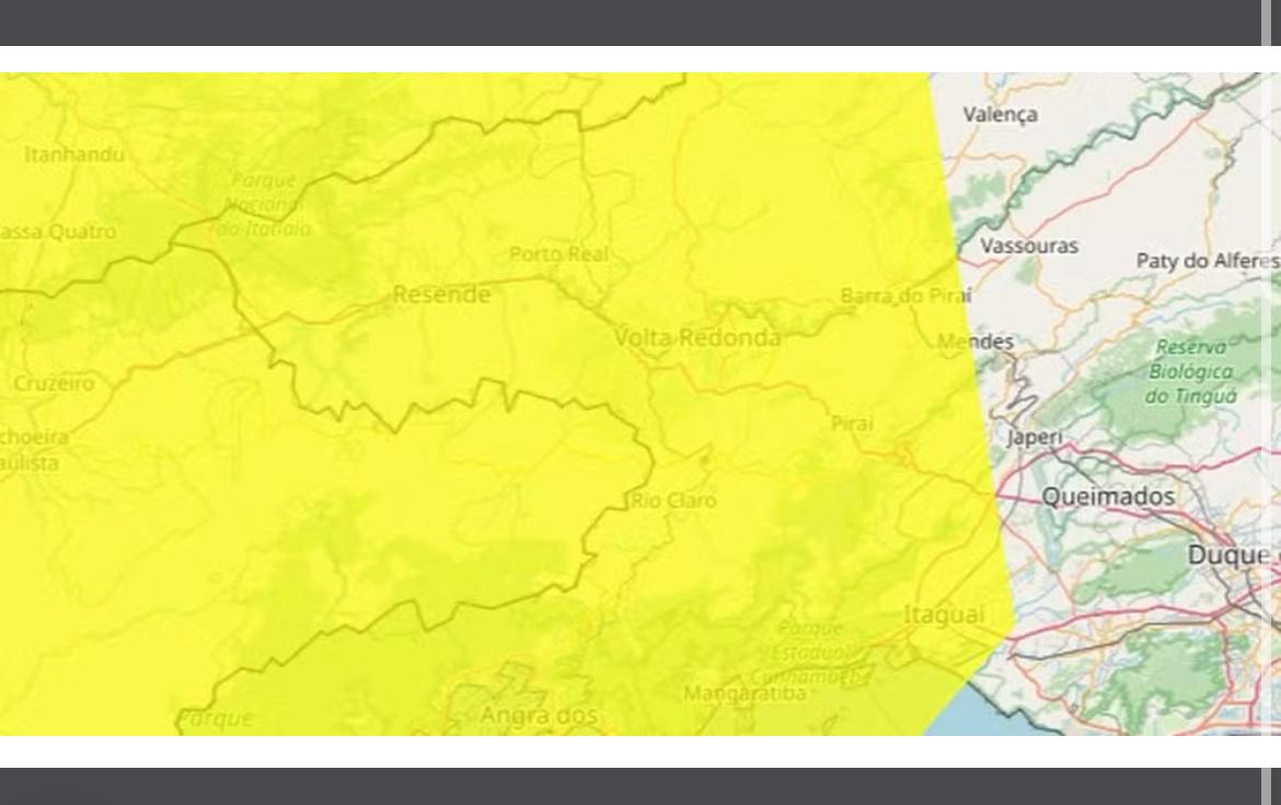 O alerta é válido para Angra dos Reis (RJ), Barra do Piraí (RJ), Barra Mansa (RJ), Engenheiro Paulo de Frontin (RJ), Itatiaia (RJ), Mendes (RJ), Paracambi (RJ), Paraty (RJ), Pinheiral (RJ), Piraí (RJ), Porto Real (RJ), Quatis (RJ), Resende (RJ), Rio Claro (RJ) e Volta Redonda (RJ).
