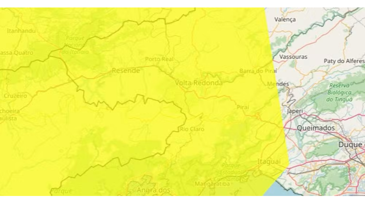 O alerta é válido para Angra dos Reis (RJ), Barra do Piraí (RJ), Barra Mansa (RJ), Engenheiro Paulo de Frontin (RJ), Itatiaia (RJ), Mendes (RJ), Paracambi (RJ), Paraty (RJ), Pinheiral (RJ), Piraí (RJ), Porto Real (RJ), Quatis (RJ), Resende (RJ), Rio Claro (RJ) e Volta Redonda (RJ).