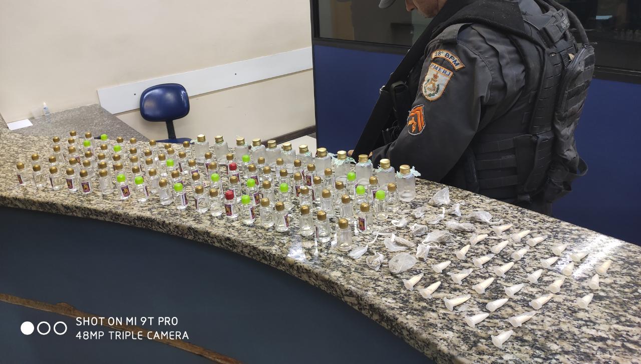 Ele estava com 30 pinos de cocaína; 98 frascos de “cheirinho da loló” e 15 “dolas” de maconha.