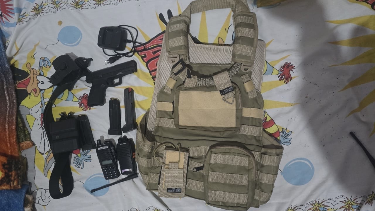 No imóvel, os policiais encontraram uma Pistola 9mm marca, 29 munições do mesmo calibre, três carregadores de pistola, um cinto tático, dois rádios de Boafeng, um Base de rádio Boafeng, uma capa de colete, um celular, 19 trouxinhas de maconha, 55 pedras de crack e R$155,00 em espécie.