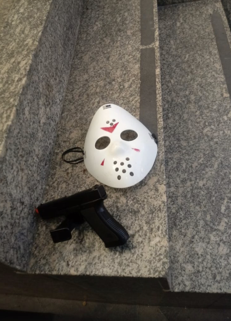 Ele estava em posse de uma réplica de pistola 9mm e uma máscara do personagem Jason do filme Sexta-Feira 13.