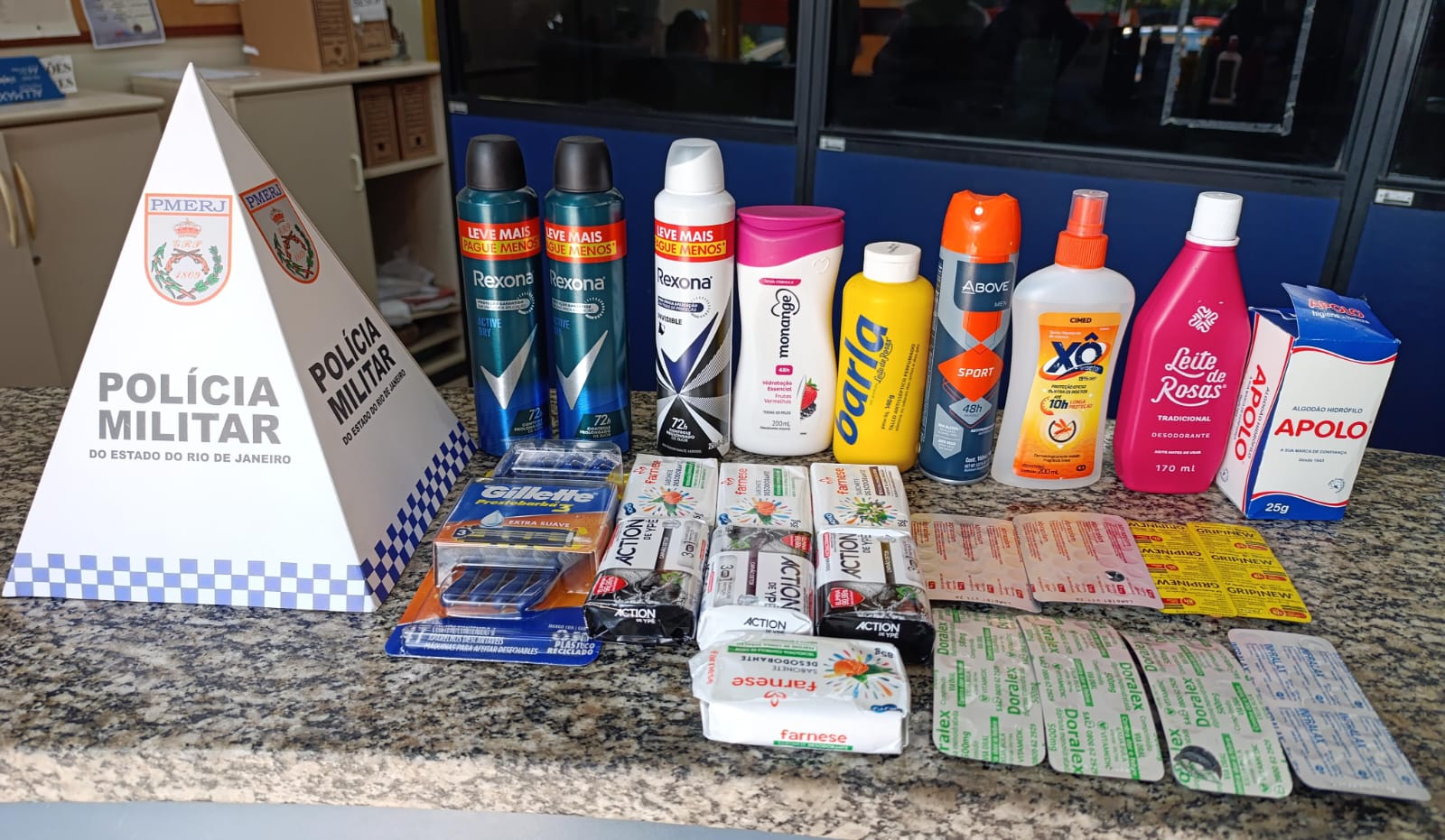 Segundo a PM, na mochila, foram encontrados quatro desodorantes, sete sabonetes, sete cartelas de comprimidos, um óleo corporal, um talco, um algodão, um repelente e um barbeador descartável.