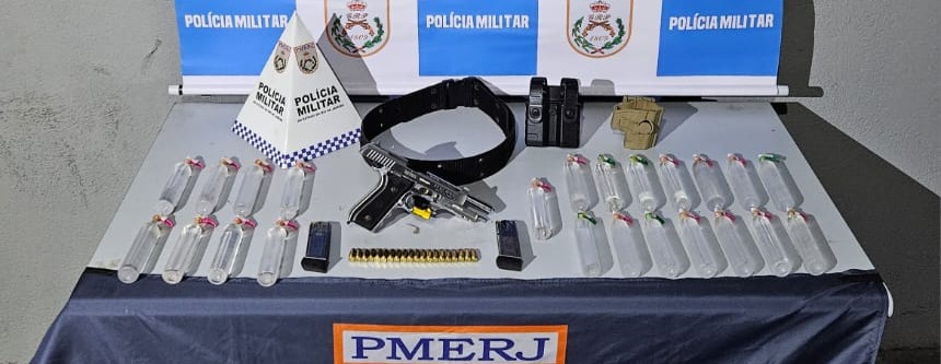 Na operação, foram apreendidos uma pistola calibre 9 milímetros com numeração raspada foi apreendida, 20 munições, um cinto tático, um coldre, três carregadores e um porta carregador, além de 24 frascos de loló.