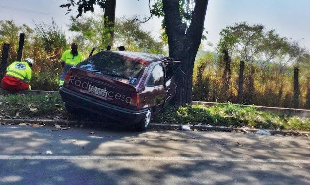 Um jovem de 19 anos, identificado como Therionn Baptista, ficou nesta quarta-feira (8) ferido após o seu carro (Kadett vinho) colidir com uma árvore em Volta Redonda.