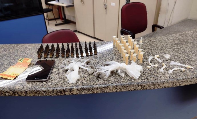 Ele foi flagrado pelos policiais quando fugia dos autores do crime pela Rua São João Del Rey, no mesmo bairro. Com ele foram apreendidos 12 pedras de crack, 28 sacolés de maconha e 81 pinos de cocaína.