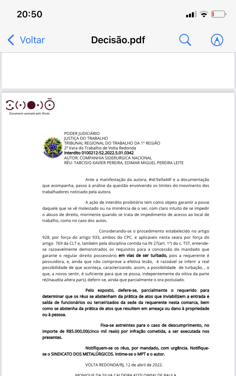 O Tribunal Regional do Trabalho da 1ª Região concedeu um interdito proibitório à CSN nesta terça-feira (dia 12). A decisão, assinada pela juíza Monique da Silva Caldeira Kozlowski, determina que dois integrantes dos movimento paralelo “se abstenham da prática de atos que inviabilizem a entrada e saída de funcionários ou terceirizados da sede da empresa. Além disso, que não pratiquem atos que resultem em ameaça ou dano à propriedade ou à pessoa”.