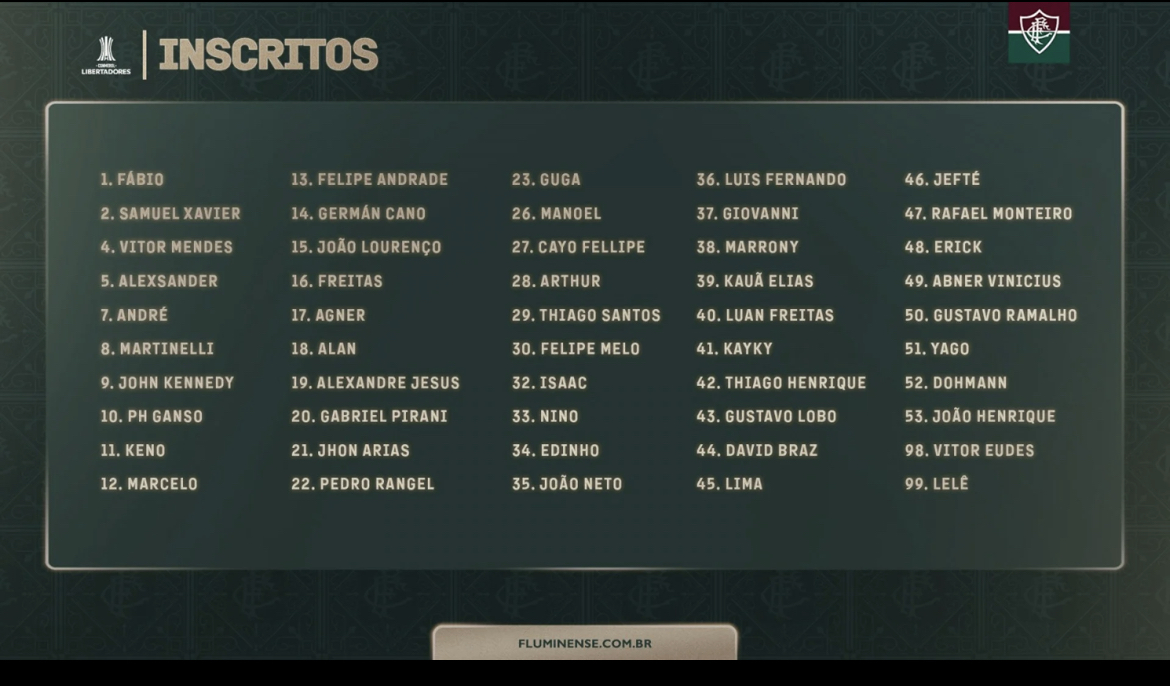 O Fluminense divulgou quais foram os 50 jogadores inscritos para a disputa da fase de grupos da Libertadores 2023. Lelê – ex-Voltaço – Thiago Santos, que foram anunciados na última semana, estão na lista. Confira abaixo: