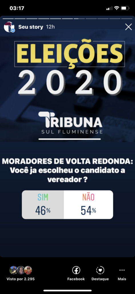A pergunta era para moradores da cidade: “Você já escolheu o seu candidato a vereador?”. O resultado foi 46% disseram que sim e 55% estão indecisos. Dos seguidores do TRIBUNA, 1.768 responderam. Por conta da legislação, não foi perguntado em quem votaria.