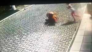 Pelas imagens, o cachorro da raça “chow chow” escapou do quintal de uma casa e avançou no menino, que estava na calçada.
