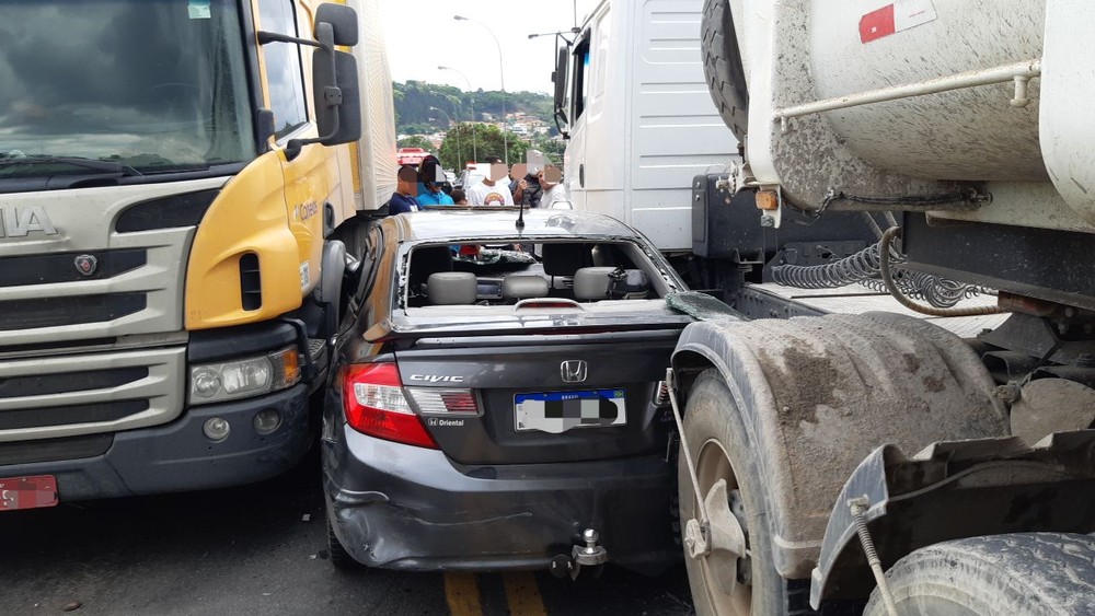 A família perseguiu o carro em outro veículo e viu o momento do acidente. Os próprios pais retiraram a criança do carro, que teve a lataria amassada e os vidros quebrados ao ficar imprensado entre as duas carretas.