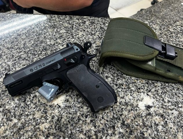 Chegando, com as características físicas do suspeito, os policiais conseguiram abordá-lo. Com ele, havia a réplica que estava encaixado em um coldre na cintura.