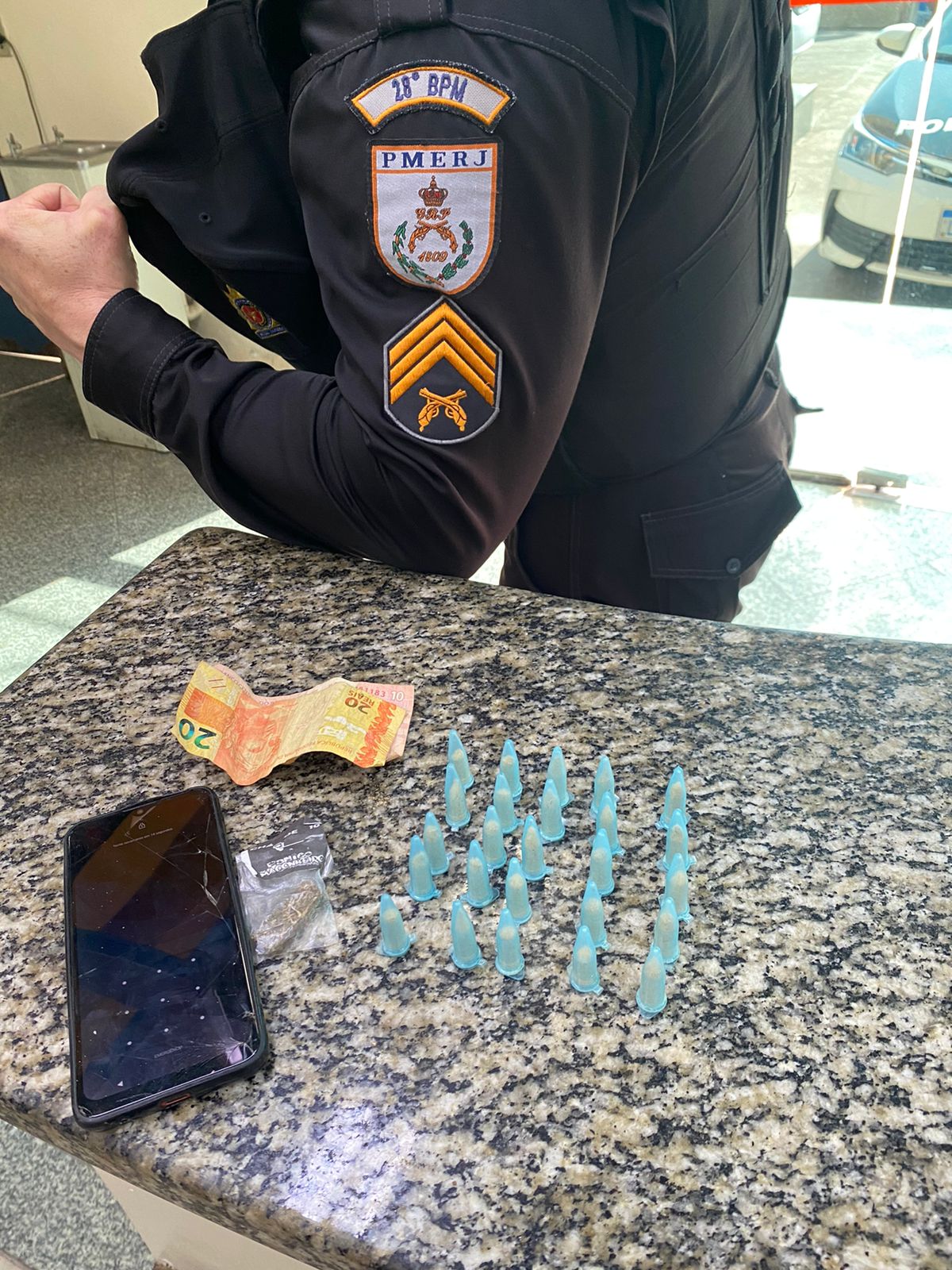 Em revista pessoal, foram encontrado 25 pinos de cocaína no momento em que vendia drogas para viciados. Ele foi levado à 90ª DP e seu pai foi chamado para acompanhar a ocorrência.
