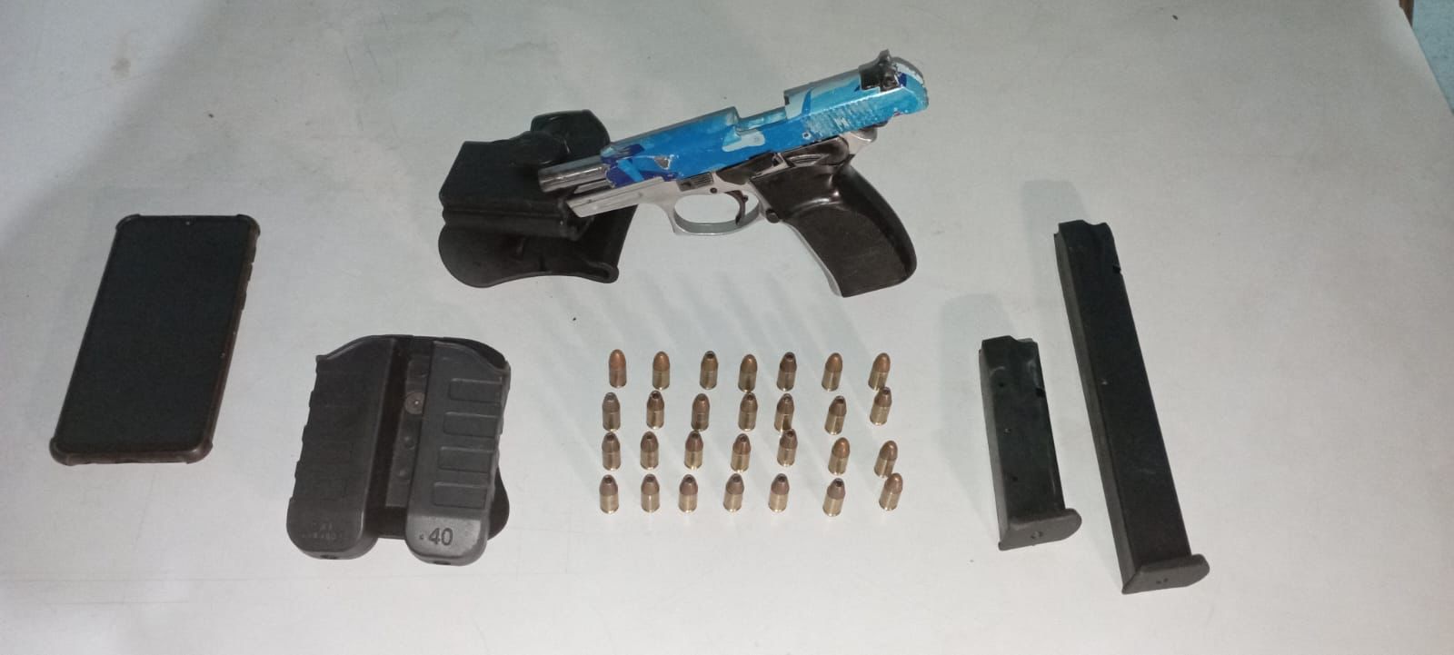 Nesse momento, ele arremessou a arma num quintal de um imóvel da rua. Os agentes assistiram a ação do adolescente, que carregava uma mochila. Dentro dela, foram encontradas 14 munições do mesmo calibre, um carregador alongado, um coldre e uma porta carregador. No quintal da casa, os policiais encontraram a pistola carregada com outras 14 munições.