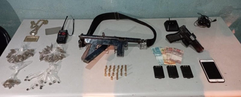 Chegando, os agentes se depararam com os dois adolescentes no condomínio popular. Após revista pessoal, foram encontrado a metralhadora calibre 380 com 20 munições, 47 trouxinhas de maconha, 13 pedras de haxixe, um rádio comunicador, uma base de rádio, três baterias de rádio, um Iphone e R$ 140,00, além de uma réplica de pistola 9 mm.