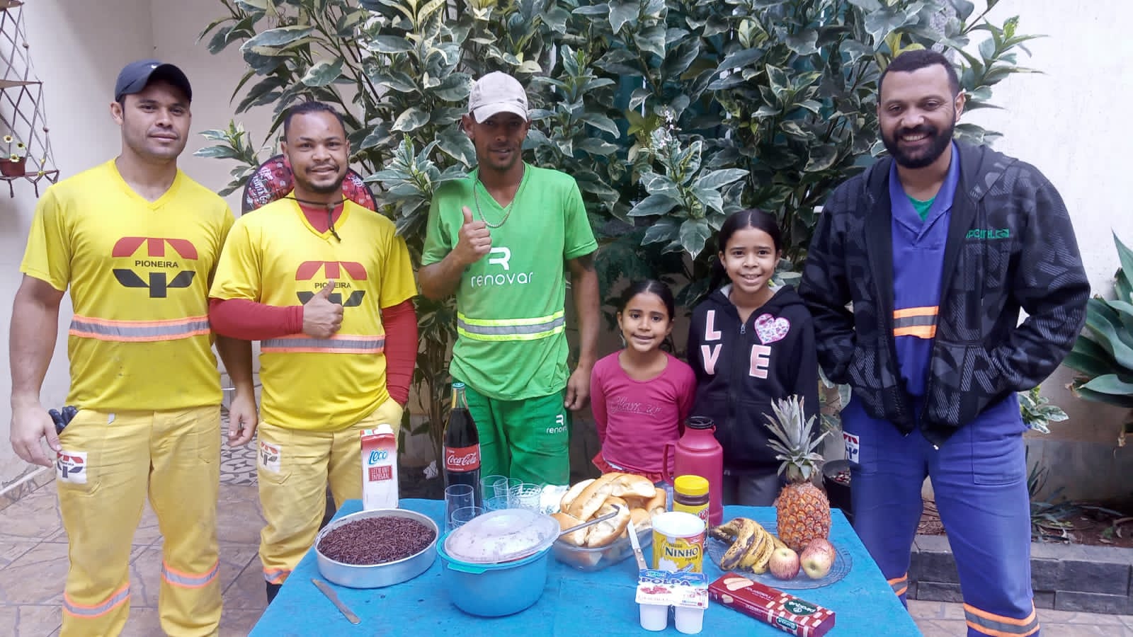 Os garis receberam frutas, bolo, biscoito, iogurtes, refrigerante, cachorro quente, café e toddy. O Rosilane teve a ajuda de duas filhas, a Letícia, de 11 anos, e Laís, de 8 anos.