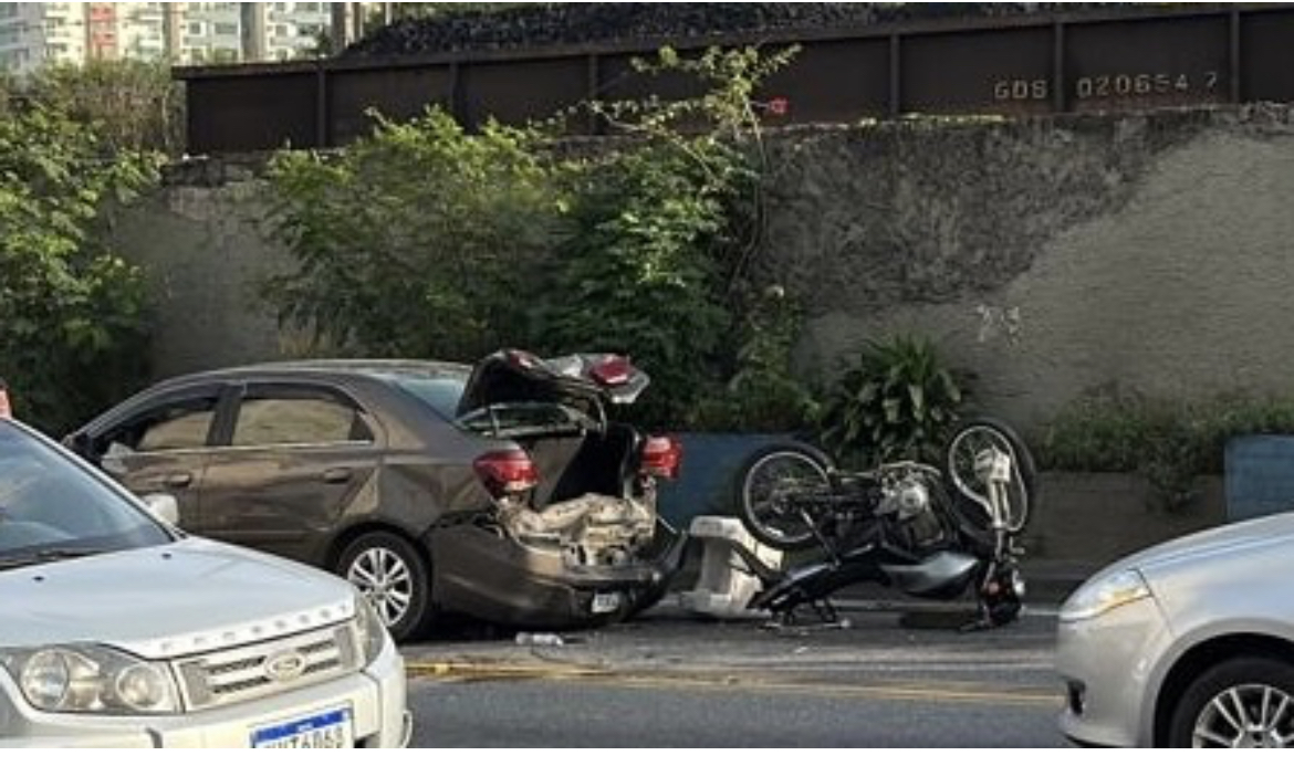 Ele bateu na traseira de carro que teve o porta mala danificado e a moto virou com as duas rodas para cima.