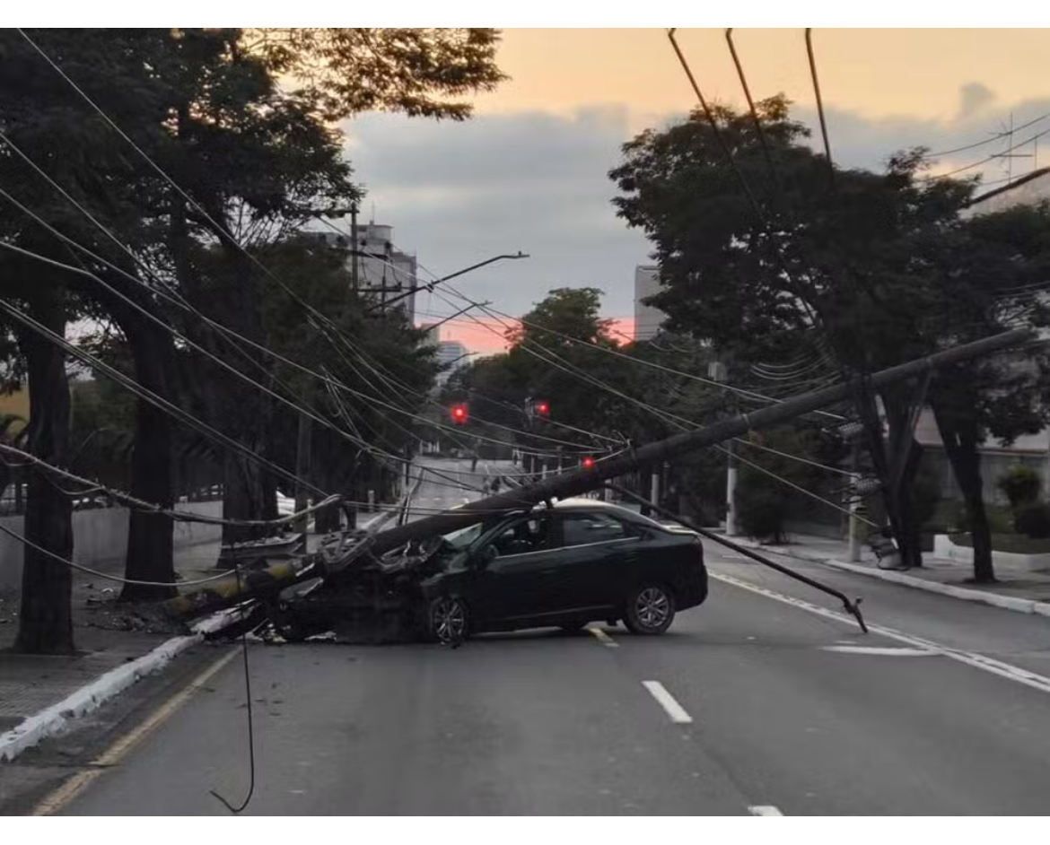 Segundo a Polícia Militar, o veículo atingiu um poste de iluminação e, com o impacto da batida, a estrutura caiu sobre o veículo.