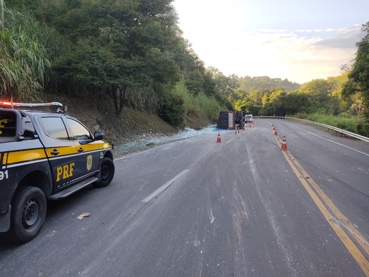 Segundo os agentes, houve um tombamento envolvendo uma carreta que estava carregada de vidro.