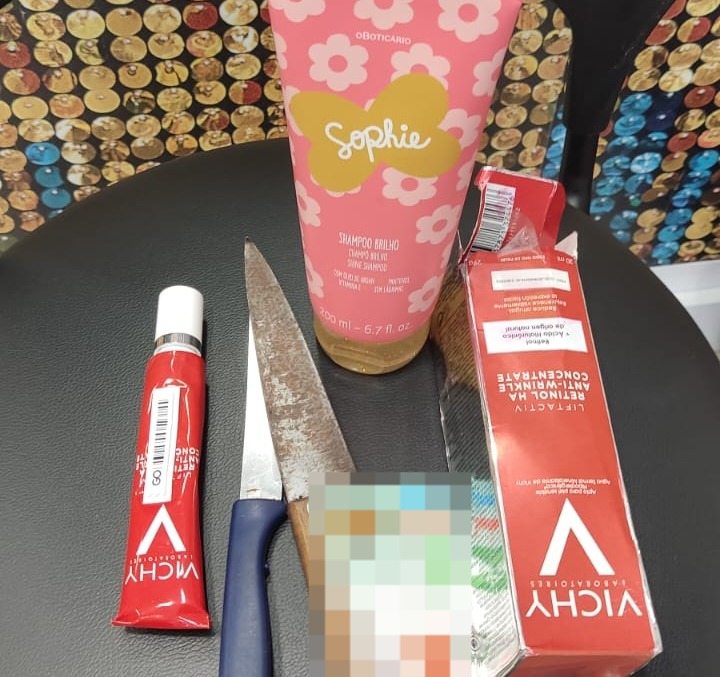 Com a suspeita, foram apreendidos um shampoo, um creme, duas facas e um vale-transporte em nome de outra pessoa. Funcionários da empresa reconheceram a mulher como autora do crime.