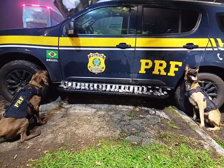 As informações são Polícia Rodoviária Federal. Durante os procedimentos de checagem e vistoria, os cães farejadores indicaram a presença do entorpecente dentro de uma mala preta no compartimento de bagagens. A passageira foi identificada pelo tíquete da bagagem.