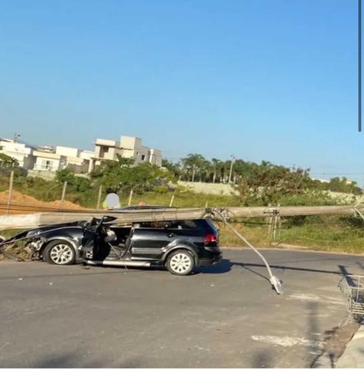 Com o impacto da batida, o poste caiu sobre o veículo e derrubou a fiação da rua, deixando parte dos moradores sem energia elétrica.