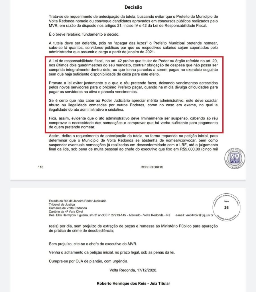 Em dezembro, o juiz da 4ª Vara Cível de Volta Redonda, Roberto Henrique dos Reis, decidiu que o prefeito Samuca Silva deveria se abster de nomear ou contratar servidores aprovados em concursos públicos promovidos pelo município.