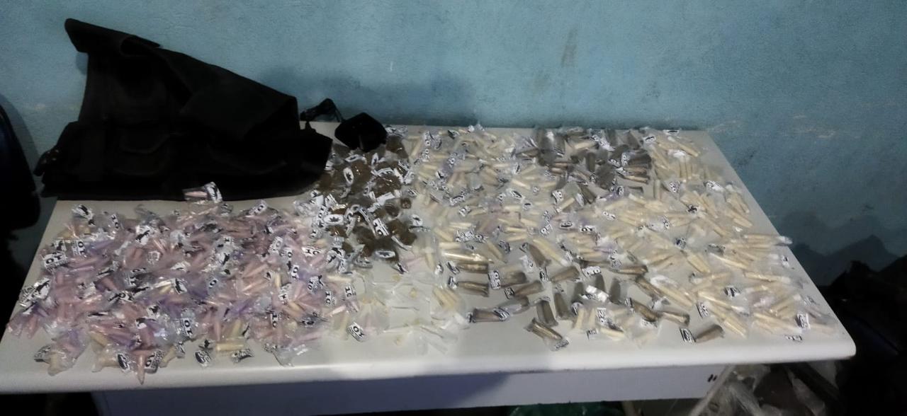 Em varredura pelo terreno, os agentes encontraram duas sacolas com drogas. Nelas, ainda segundo a ocorrência, foram encontradas 525 pinos de cocaína, 53 trouxinhas de maconha, 14 pedras de crack, além de uma capa de colete e uma base rádio.