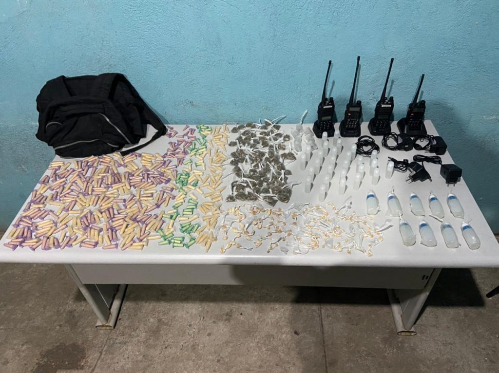 Os suspeitos que pegaram a mochila conseguiram fugir pela linha férrea, mas a mochila foi apreendida com 411 pinos de cocaína, 157 pedras de crack, 74 trouxinhas de maconha, 36 frascos de loló, 7 recipientes com haxixe, 4 rádios transmissores com 4 bases e 1 fone de rádio.
