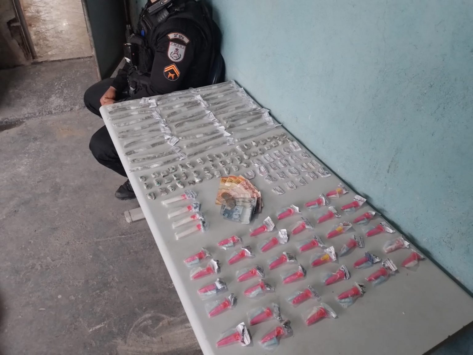 O jovem foi encontrado com 77 trouxinhas de maconha, 74 pinos de cocaína e 21 pedras de crack, além de R$ 136. O jovem recebeu voz de prisão por tráfico de drogas. Já o idoso foi conduzido para a delegacia como testemunha.