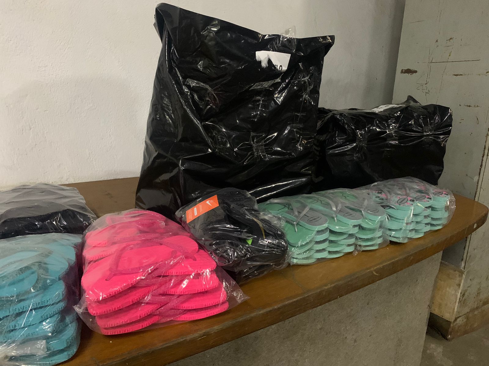Entre o material apreendido estão marcas de chinelos e tênis famosos.