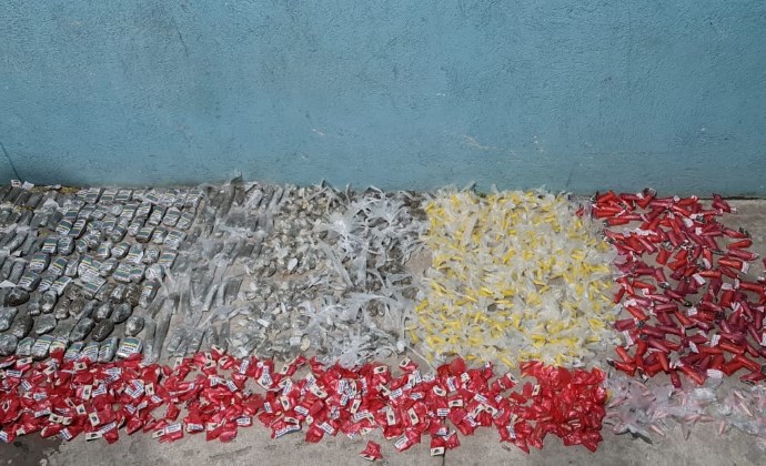 Do material apreendido, 1.010 foram de cápsulas de cocaína, 238 sacolés, 79 tiras e 73 pedaços de maconha. Todo o material estava numa área de mata do bairro