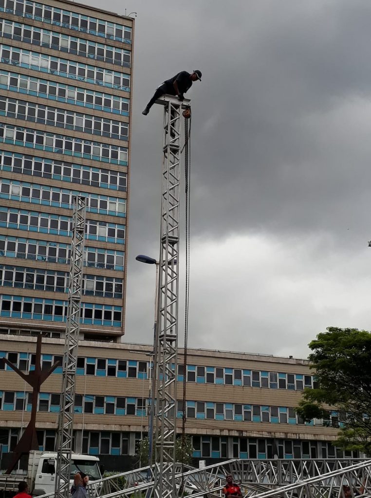 Um homem estava pendurado de uma altura de aproximadamente de dez metros: sem cinto de segurança e capacete, com apenas uma luva e um boné.
