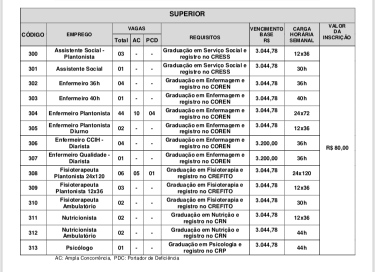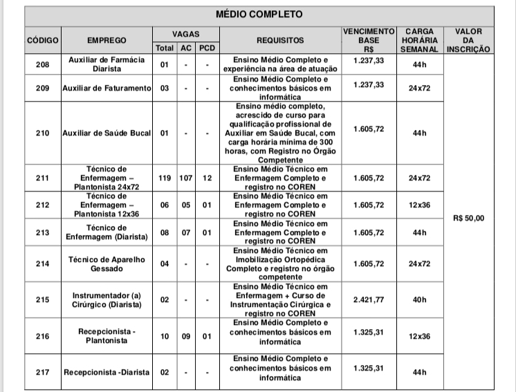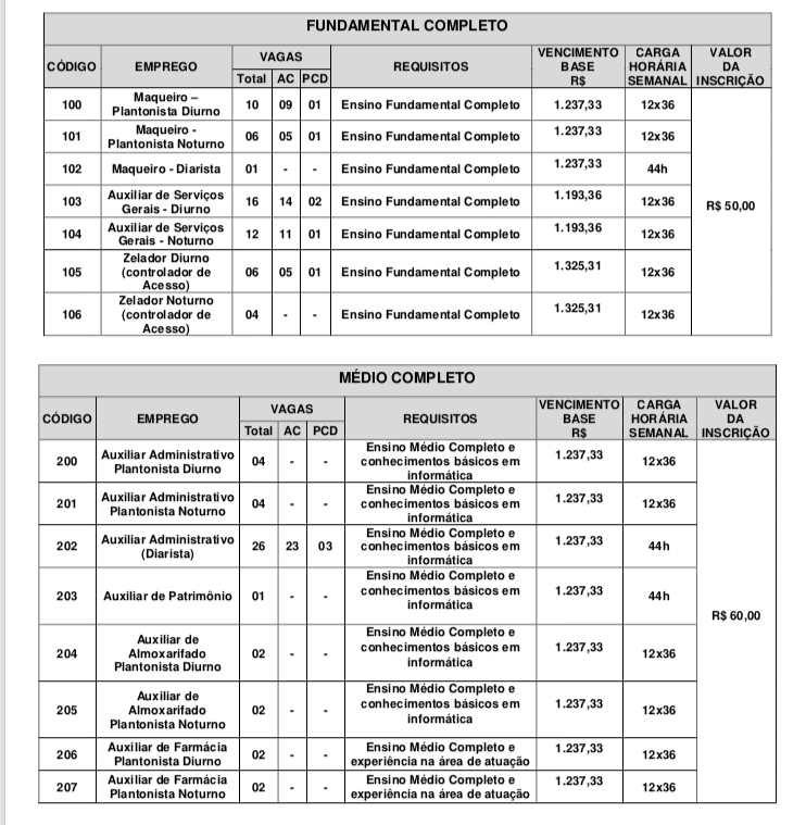 As chances são para os cargos de Maqueiro, Auxiliar de Serviços Gerais, Zelador, Auxiliar Administrativo Plantonista, Auxiliar de Patrimônio, Auxiliar de Almoxarifado, Auxiliar de Farmácia, Auxiliar de Faturamento, Auxiliar de Saúde Bucal, Técnico de Enfermagem, Técnico de Aparelho Gessado, Instrumentador (a) Cirúrgico, Recepcionista, Assistente Social, Enfermeiro, Fisioterapeuta, Nutricionista e Psicólogo. (Confira a tabela abaixo).
