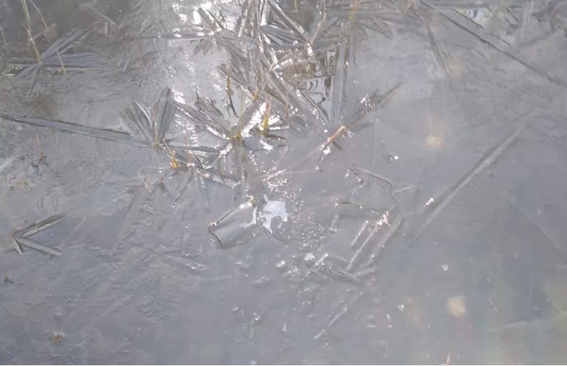 Com o frio, uma poça d’água de uma trilha dentro da reserva congelou