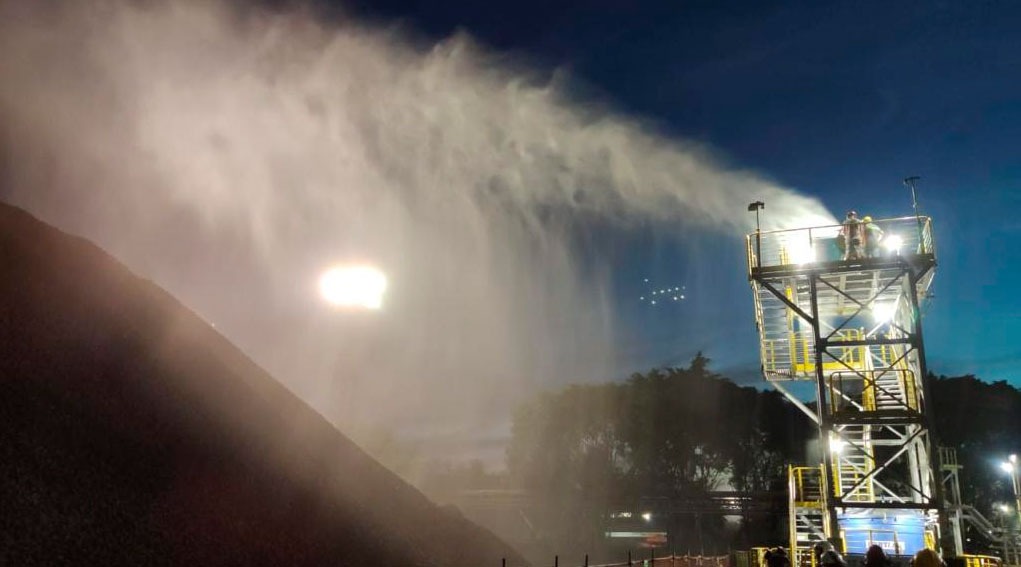 O canhão de névoa se assemelha a uma turbina de avião e funciona pelo lançamento de uma névoa úmida, a uma distância entre 50 e 150 metros, sobre pilhas e demais potenciais fontes de emissão fugitiva de material particulado.