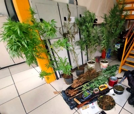 Na residência foram encontrados, além dos pés de maconha, uma espingarda, seis munições – uma deflagrada – calibre 20, sete munições calibre 22, um pino de cocaína e oito celulares, juntamente com galhos e folhas secas de maconha