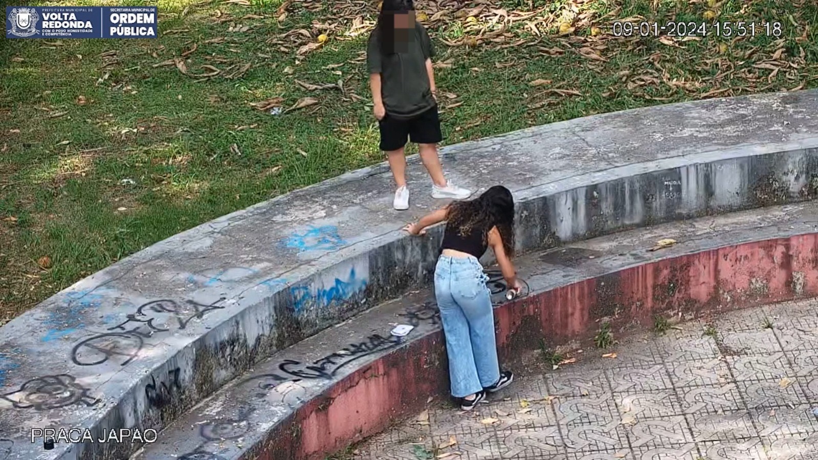 Duas adolescentes foram conduzidas à delegacia da Polícia Civil (93ª DP) por policiais militares da Operação Segurança Presente nesta terça-feira (9), após serem flagradas pichando a Praça Japão, na Vila Santa Cecília, em Volta Redonda. A ação foi flagrada por câmeras do Ciosp (Centro Integrado de Operações de Segurança Pública), que auxiliaram os agentes a chegarem às menores.