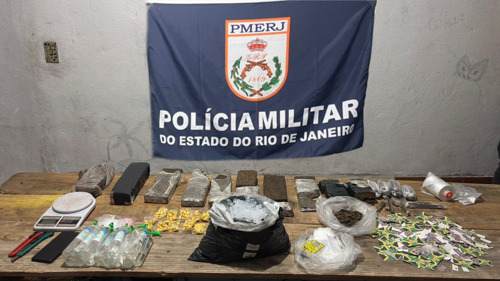 Diante da fuga, os policiais entraram no imóvel para averiguação. Durante as buscas, foram encontrados aproximadamente 7,1 quilos de maconha, 300 comprimidos de ecstasy e 13 frascos de lança-perfume, totalizando cerca de 1,3 litro da substância. Além das drogas, também foram apreendidos dois aparelhos celulares, duas balanças de precisão e uma grande quantidade de material utilizado para embalar os entorpecentes.