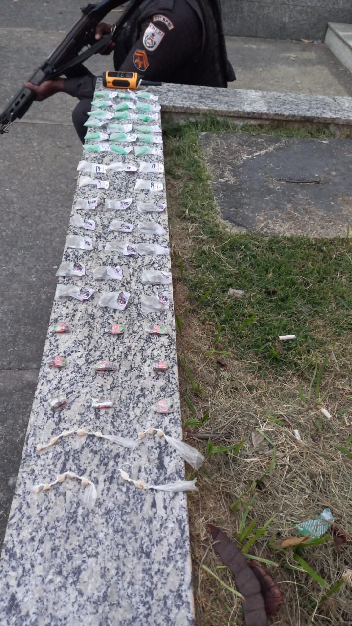 Após uma denúncia de possível tráfico de drogas na rua das Palmeiras, no bairro Cidade Alegria, agentes da Polícia Militar de Resende foram até o local para verificar a procedência da informação. Ao chegarem no local, não foi possível encontrar ninguém, porém em uma busca, os agentes encontraram em um monte de areia uma sacola contendo 23 pinos de cocaína, 24 trouxinhas de maconha, 15 pedras de crack e um rádio transmissor.