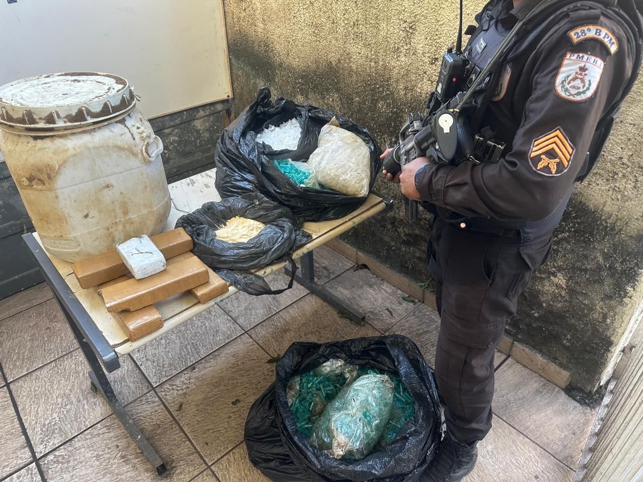 Chegando, em varredura pelo local, os agentes encontraram um tonel enterrado contendo os entorpecentes. Segundo os agentes, foram arrecadados cinco tabletes de maconha, 600 gramas de cocaína e 10 mil pinos vazios. Ninguém foi preso e material foi levado para a delegacia de Volta Redonda (93º DP).