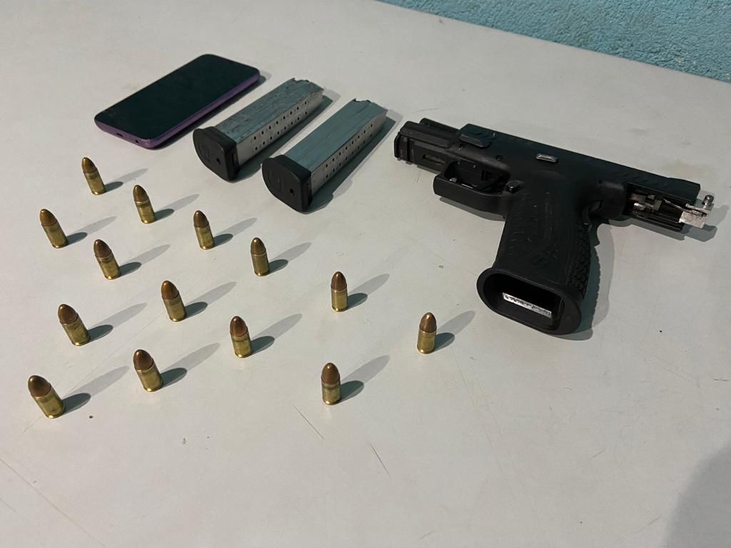 Com a dupla, foram apreendidas uma pistola 9 mm com kit rajada, dois carregadores, 14 munições e um celular. Segundo a ocorrência, os policiais foram chamados ao endereço após uma denúncia de homens armados e efetuando disparos.