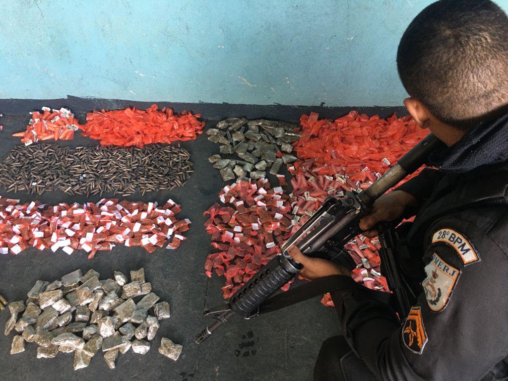 Outra, formada por policiais do Serviço Reservado, apreendeu 172 trouxinhas de maconha e 548 pinos de cocaína. Uma terceira equipe de policiais foi responsável pela apreensão de 20 munições calibre 762, 1.178 pinos de cocaína, uma touca ninja e 292 unidades de maconha.